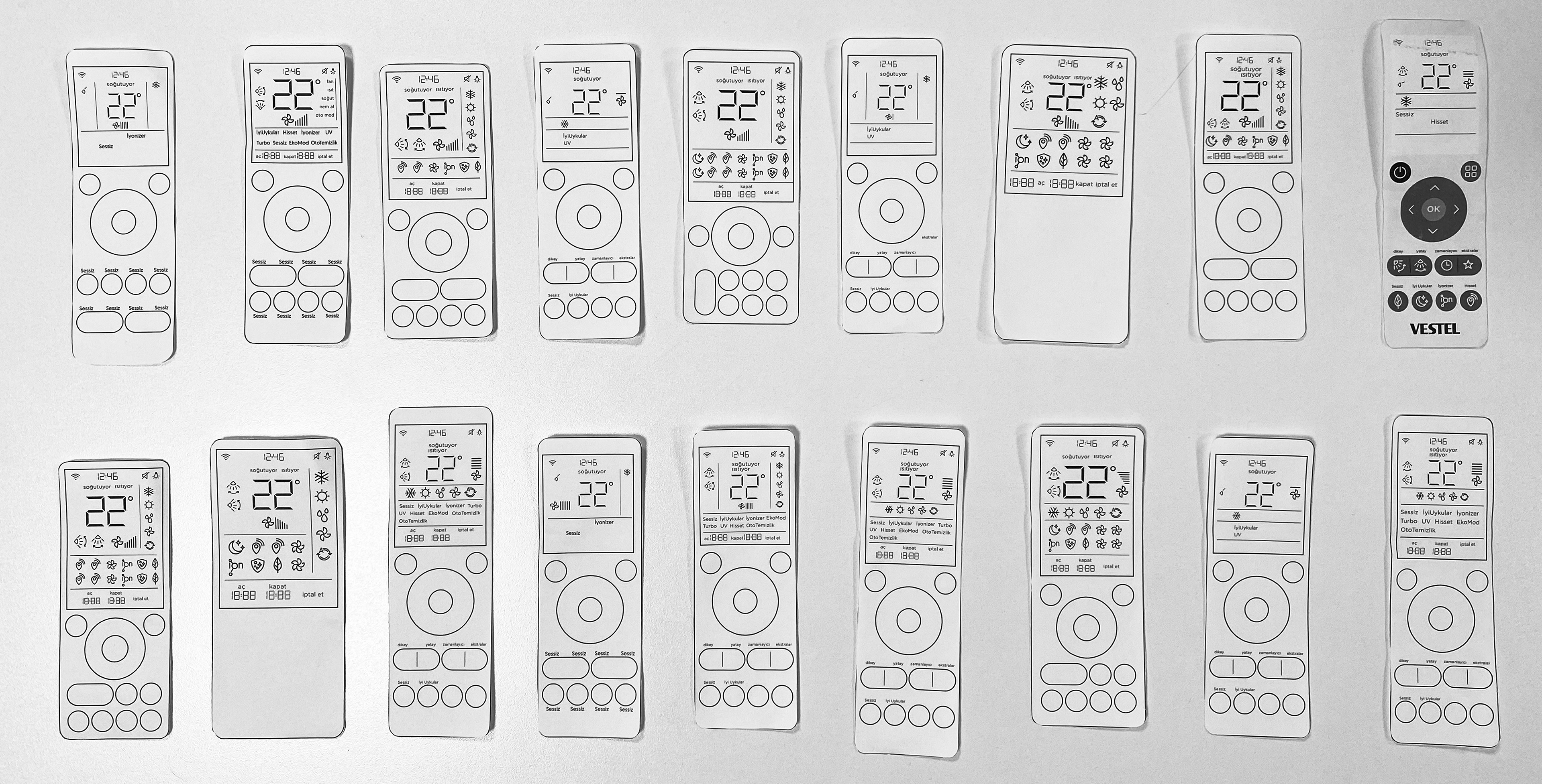 An in-depth review of the competitive landscape was conducted, examining over 25 brands, including current and older remote control models from companies such as Samsung, Daikin, Mitsubishi, Panasonic, Midea, Xiaomi, Haier, and Beko. This analysis evaluated common features, usability approaches, and form factors, highlighting user priorities such as intuitive layouts, enhanced functionality, and seamless visual integration with modern interiors.